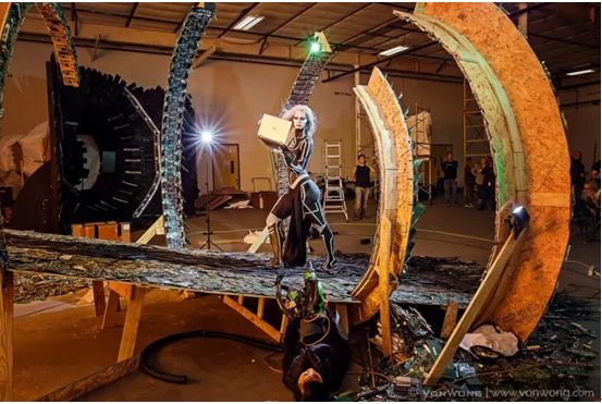 志愿者們?cè)诿總€(gè)拱門(mén)上花費(fèi)了6個(gè)小時(shí),將其用電路板完全覆蓋。此外,還花了8個(gè)小時(shí)為模特做頭發(fā),化妝和身體彩妝。