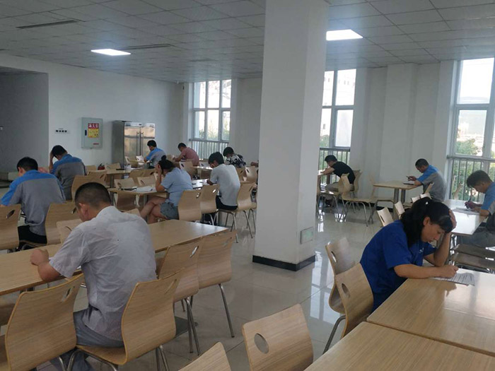 2019年8月10日,中天電廢食堂聚集著一群人,他們個個精神飽滿、奮筆疾書,原來是中天電廢生產車間各生產線班組長、辦公室及物控組全體員工正在參加公司舉行的安全、7S及規范考核,考核采用筆試的方式,考試題型為判斷題、選擇題、簡答題,共計100分;考試內容定為安全、7S管理、規范三部分,所占比例分別為30%、30%、40%。