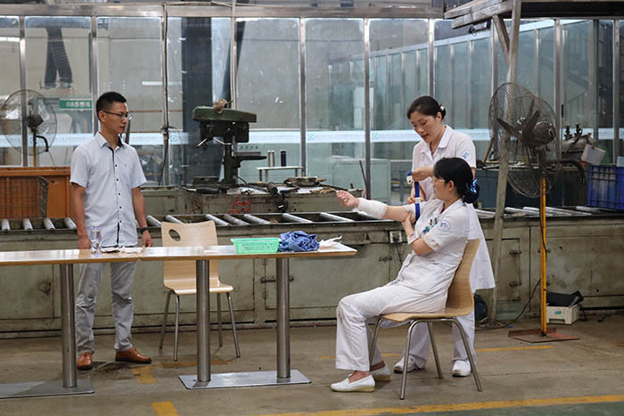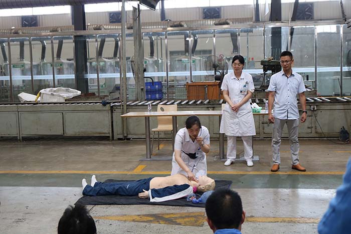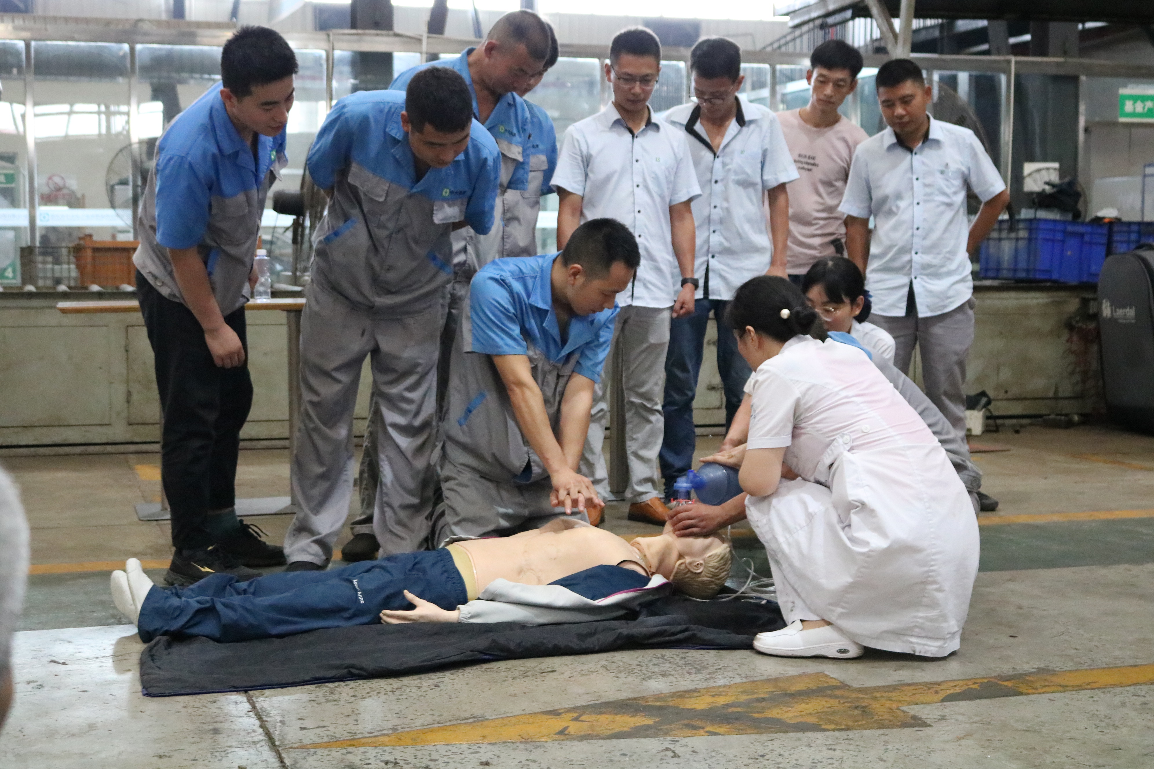 通過理論與演示相結合的方式,譚紅護士長就心肺復蘇、外傷包扎、擔架使用等急救知識與技能進行了詳細講解。為了更直觀地展示心肺復蘇的正確操作方法,譚紅護士長特意攜帶人體模型進行現場演示。演示完畢,生產車間各班組長積極參與實操演練,譚紅護士長耐心指導,手把手教學,讓員工真正掌握心肺復蘇的救護技巧。
