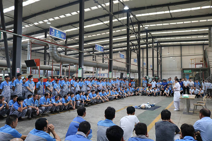 為進一步普及急救知識,提高員工應對突發事件和意外傷害事故的自救與施救能力,2019年8月22日,雙橋經開區人民醫院譚紅護士長及其同事受邀走進重慶市中天電子廢棄物處理有限公司,對全體員工進行了急救知識講解與模擬實操培訓。