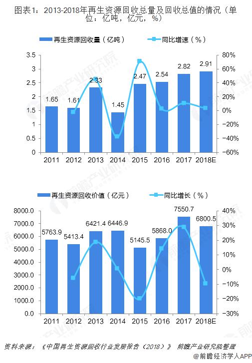 2013-2017年,再生資源回收量和回收總值年復(fù)合增長(zhǎng)率分別為3.89%和3.12%,行業(yè)增長(zhǎng)率較低。不過(guò),伴隨著2015年再生資源領(lǐng)域政策的開(kāi)始完善和盈利模式的持續(xù)創(chuàng)新,行業(yè)拐點(diǎn)漸顯,市場(chǎng)低迷的態(tài)勢(shì)逐步改善。預(yù)測(cè)后十三五時(shí)期,再生資源回收體系制度將逐步完善,市場(chǎng)化程度也將逐步提高,行業(yè)有望延續(xù)景氣度。