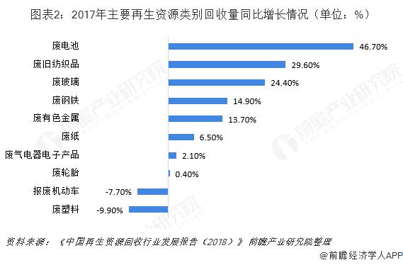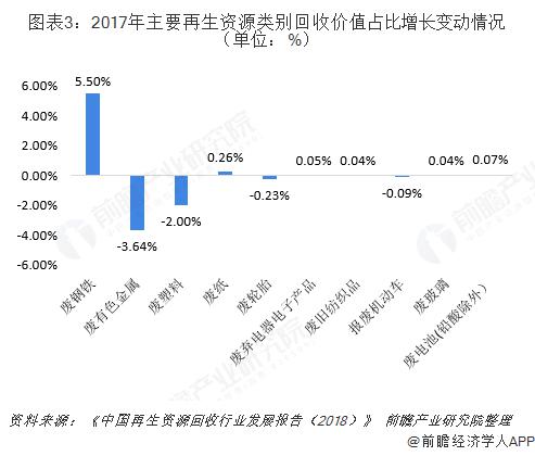 從細(xì)分領(lǐng)域來(lái)看,2017年回收量方面,廢電池回收增長(zhǎng)率高達(dá)46.7%,遠(yuǎn)高于其他細(xì)分子行業(yè),僅報(bào)廢機(jī)動(dòng)車和廢塑料回收量出現(xiàn)負(fù)增長(zhǎng)。回收價(jià)值方面,廢鋼鐵、廢有色金屬、廢塑料和廢紙為主要細(xì)分子行業(yè),回收價(jià)值占總值的95%左右,2017年回收價(jià)值占比增長(zhǎng)最多的是廢鋼鐵(+5.5%),下降最多的是廢有色金屬(-3.6%)。