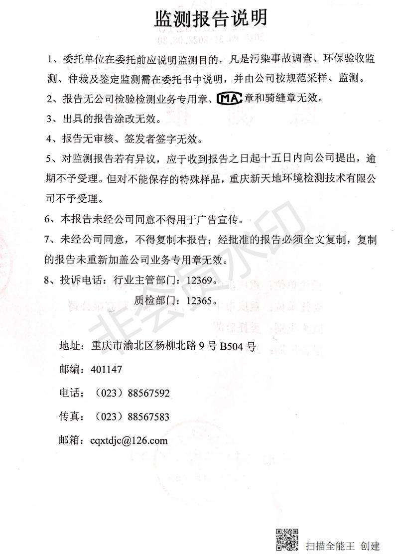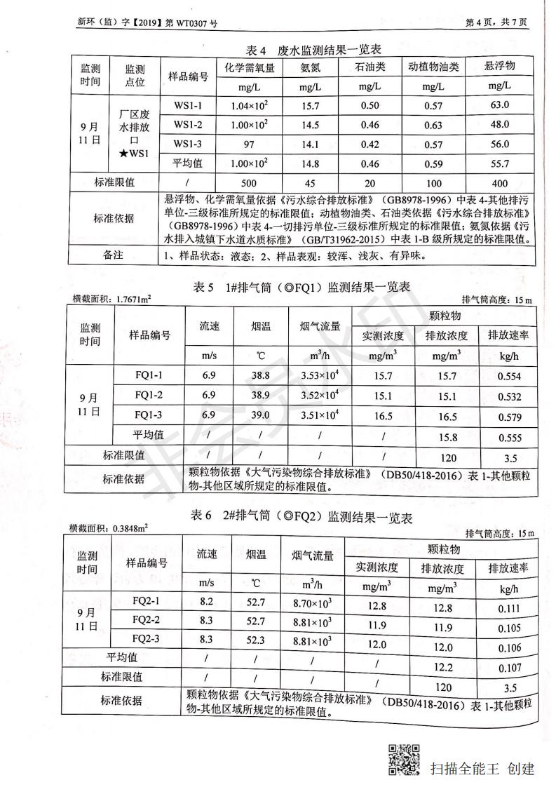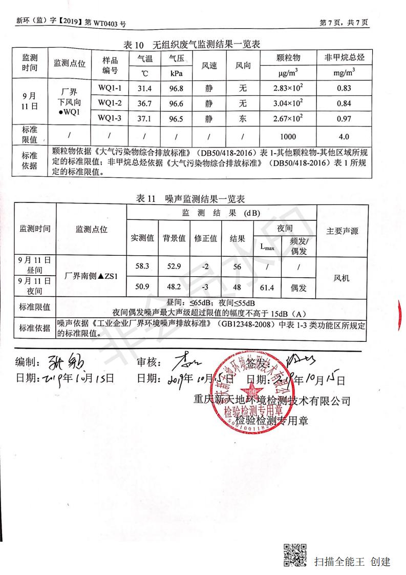 2019年10月15日,我司委托第三方機構進行了2019年度第三季度監測,監測項目為水氣聲,各項數據達標,現將監測報告公示如下: