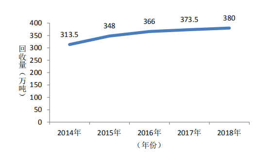 2018年,電視機(jī)、電冰箱、洗衣機(jī)、房間空氣調(diào)節(jié)器、電腦的回收量約為16550萬臺,約合380萬噸;2018年,廢電視機(jī)和廢電腦的回收價格相較于2017年有所回落但幅度不大,廢洗衣機(jī)、廢冰箱、廢空調(diào)的回收價格相較于2017年有所上升。隨著政策的完善,規(guī)劃內(nèi)的廢棄電器電子產(chǎn)品回收處理企業(yè)基本已全部進(jìn)入市場,目前全國共有29個省(區(qū)、市)的109家廢棄電器電子產(chǎn)品處理企業(yè)納入廢棄電器電子產(chǎn)品處理基金補(bǔ)貼企業(yè)名單,合計年處理能力達(dá)到 1.61億臺(套)。2014-2018年我國廢棄電器電子產(chǎn)品回收情況如下圖所示。