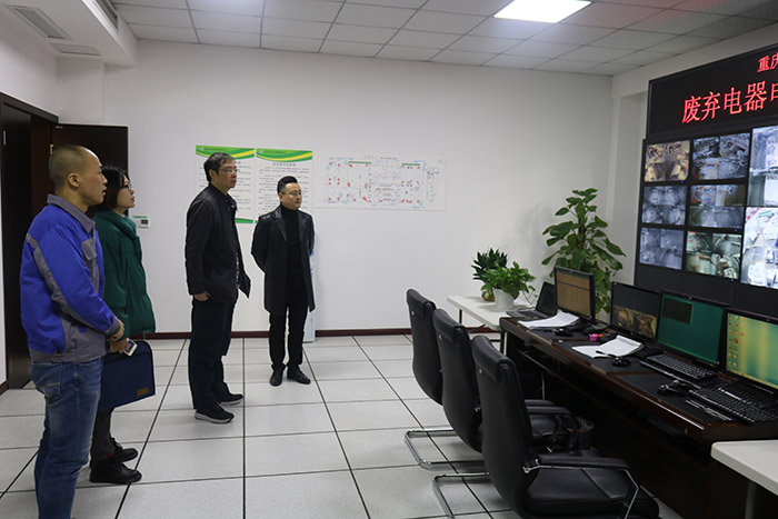 2019年12月4日,重慶市固體廢物管理中心主任劉強一行蒞臨中天電廢考察調研,在公司總經理彭會剛的陪同下,依次參觀了榮譽墻、環保教育展廳、視頻監控中心及生產車間。