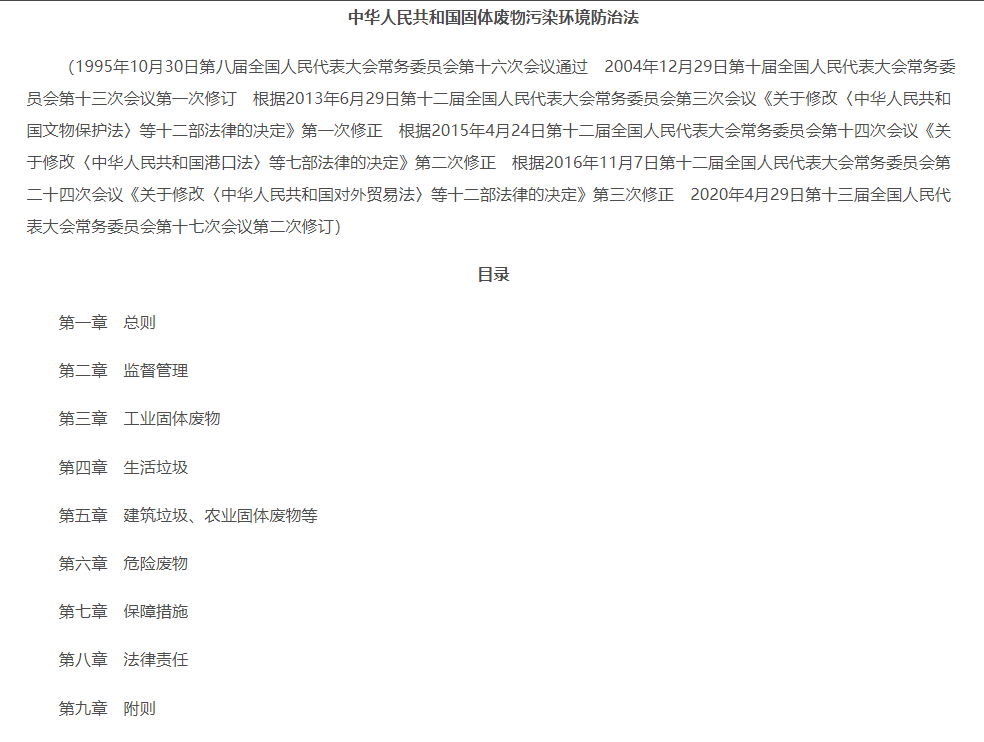 4月29日,十三屆全國人大常委會第十七次會議審議通過了修訂后的固體廢物污染環境防治法,自2020年9月1日起施行。