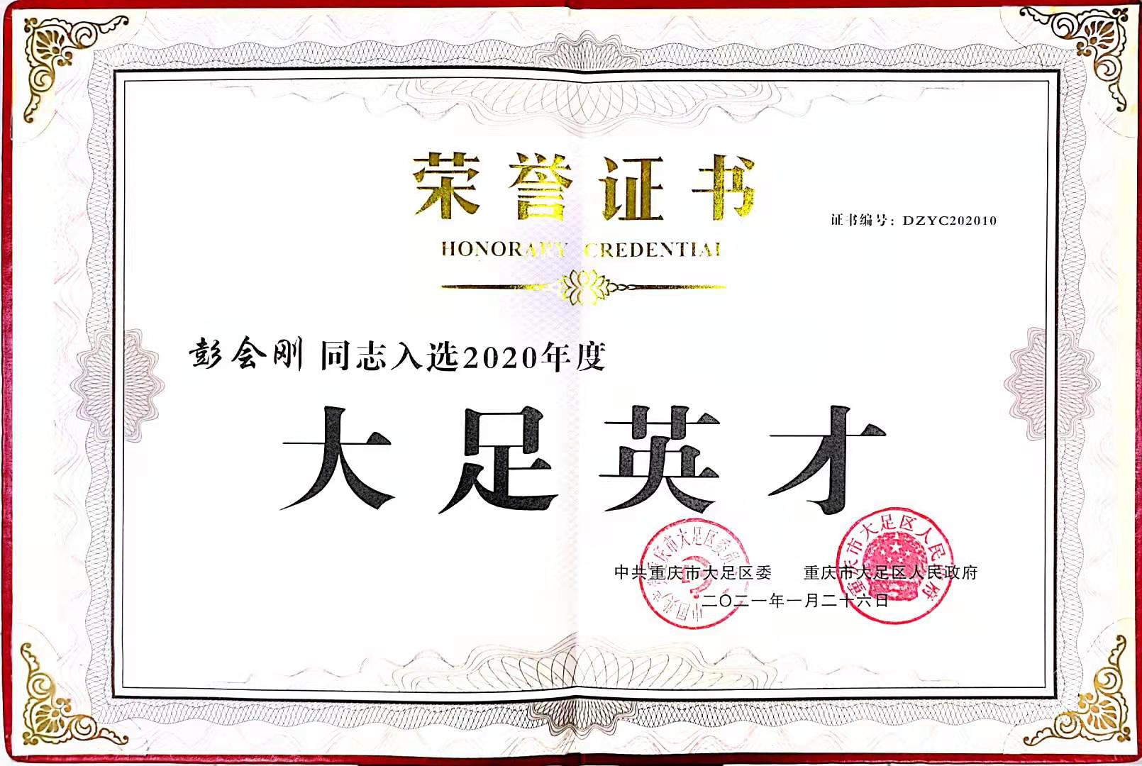2021年1月27日,大足區(qū)2020年度“大足英才”頒證活動(dòng)在大足區(qū)人民政府隆重舉行,此次大足英才遴選活動(dòng)由大足區(qū)委人才工作領(lǐng)導(dǎo)小組主辦,旨在表彰為大足區(qū)經(jīng)濟(jì)社會(huì)發(fā)展積極作出貢獻(xiàn)的10名優(yōu)秀人才。中天電廢總經(jīng)理彭會(huì)剛同志入選2020年度大足英才。