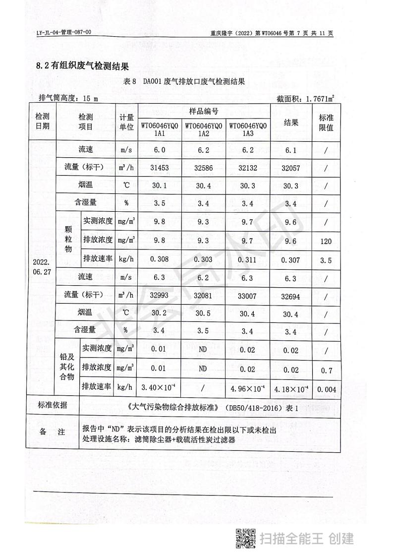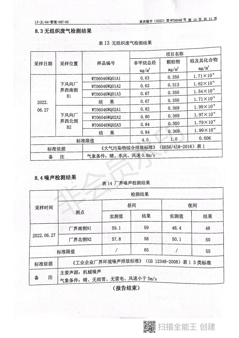 2022年6月27日,我司委托第三方機構(gòu)進行了2022年度第二季度監(jiān)測,監(jiān)測項目為水氣聲,各項數(shù)據(jù)達標,現(xiàn)將監(jiān)測報告公示如下: