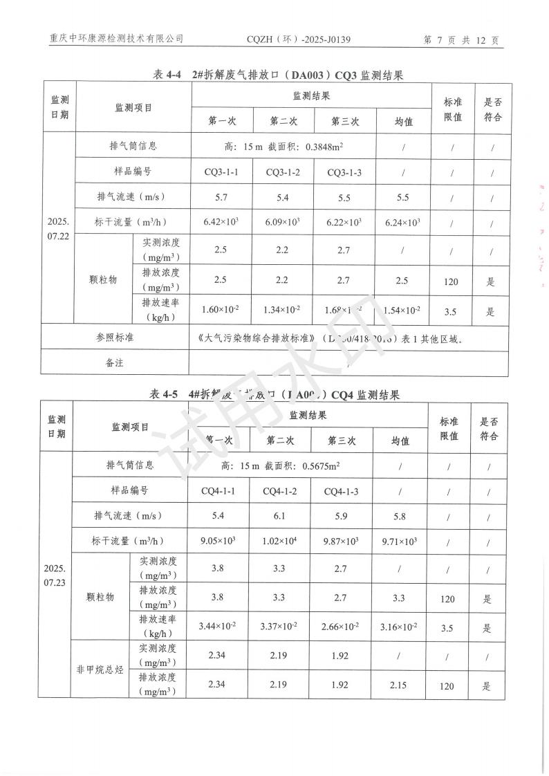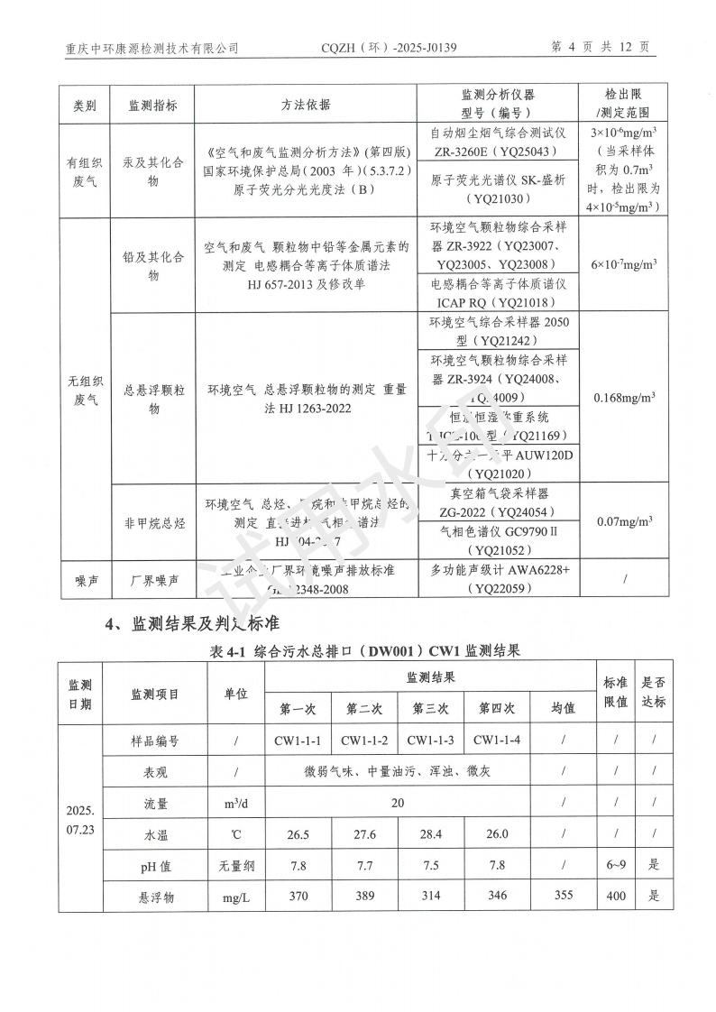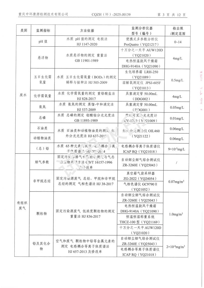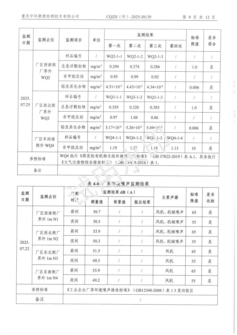 2025年7月22日,我司委托第三方機構進行了2025年度第三季度監測,監測項目為水氣聲,各項數據達標,現將監測報告公示如下: